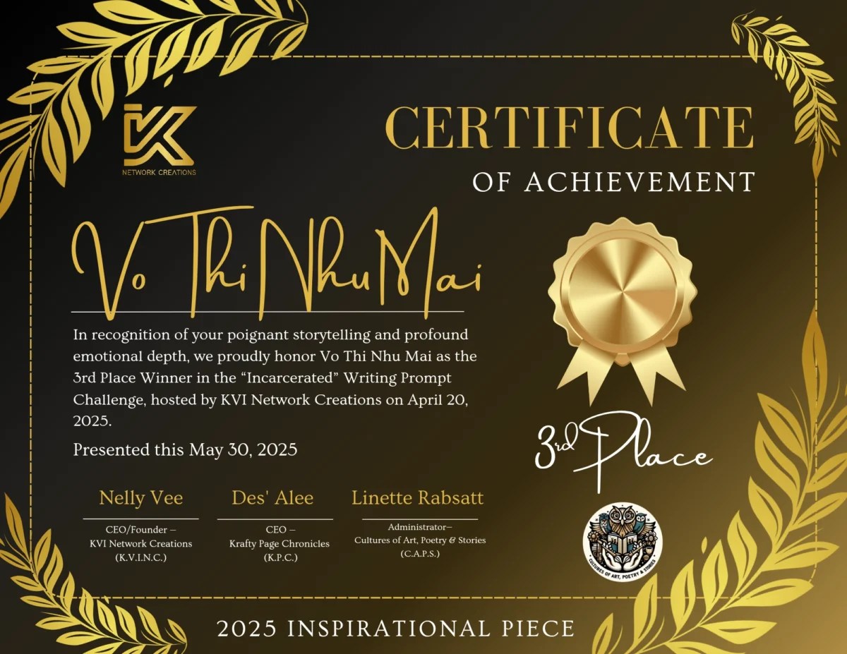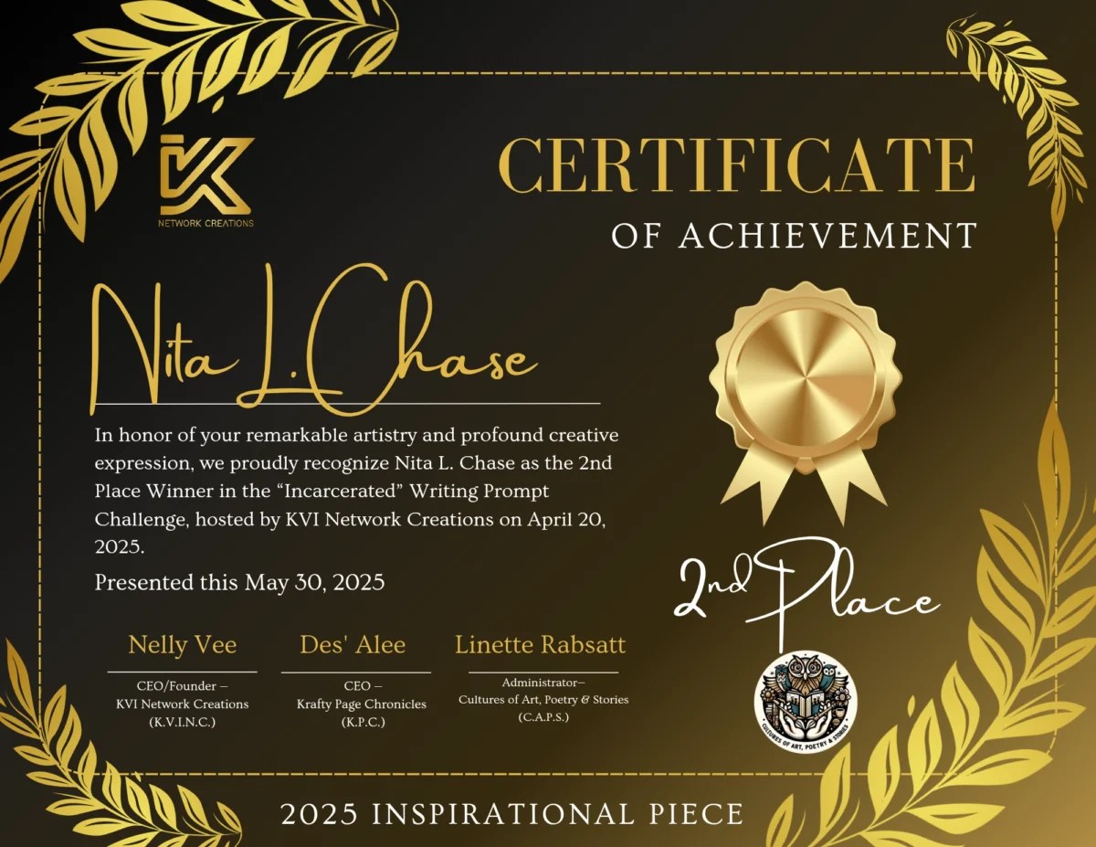 KVI Network Creations, in proud partnership with Krafty Page Chronicles and C.A.P.S. (Cultures of Art, Poetry & Stories), officially announces the final results of the “Incarcerated” Writing Prompt Competition—an initiative that challenged writers worldwide to explore themes of confinement in its many forms: physical imprisonment, mental barriers, societal shackles, and internal struggles.